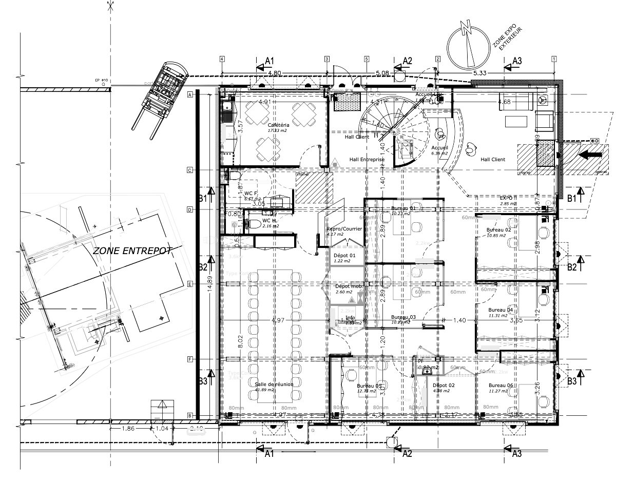Rénovation d’un ancien hangar en bureaux de direction pour le groupe Caïali, avec atelier attenant dédié au moulage, à l’étuvage et au stockage. Le projet affirme une écriture industrielle assumée : structure métallique existante et nouvelle laissée apparente, réseaux visibles et faux plafonds en bac acier, alliant esthétique brute et maîtrise budgétaire.
