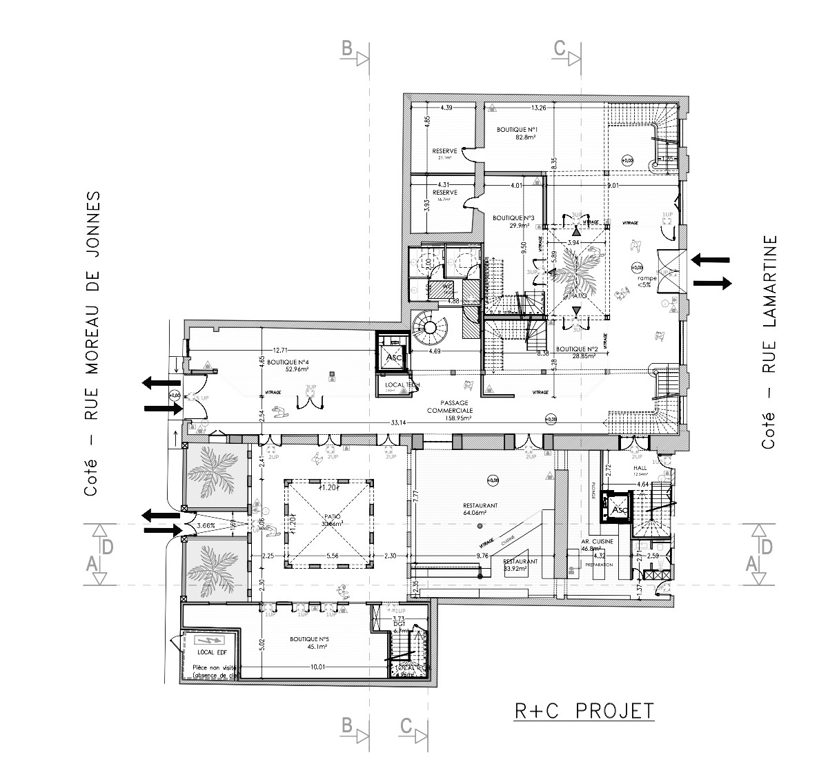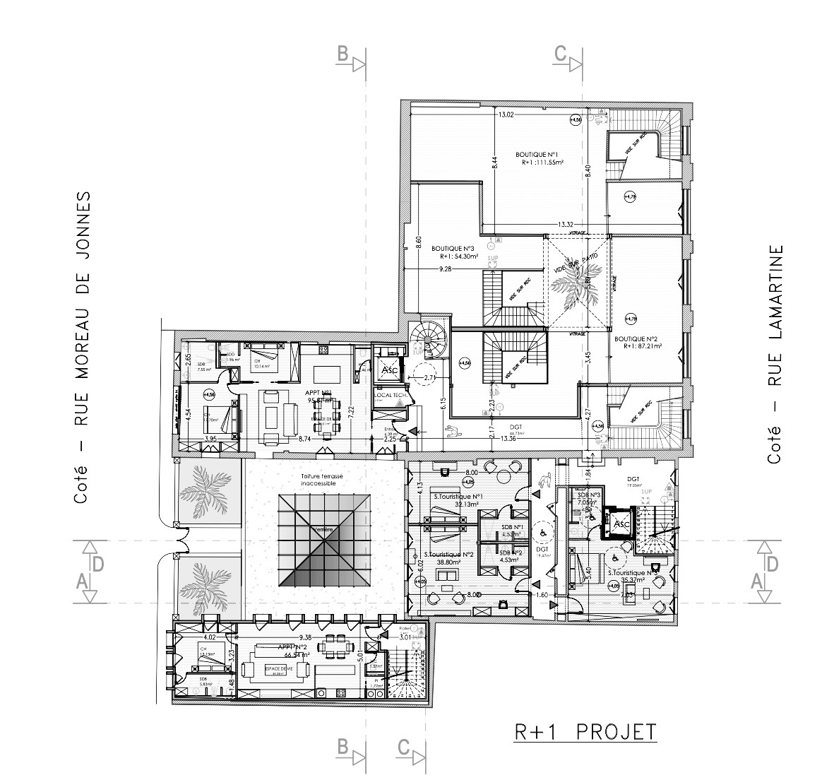 Après démolition d’un bâtiment annexe, une nouvelle entité attenante est édifiée dans un langage Art déco contemporain, en dialogue avec l’existant. Programme : mini-centre commercial, restauration, hôtellerie, appartements de standing et bureaux partagés en dernier étage. Un patio à colonnes structure la cour centrale, tandis qu’un jardin d’accueil conservé rue Moreau de Jonnès renforce l’ouverture urbaine et la qualité d’usage.