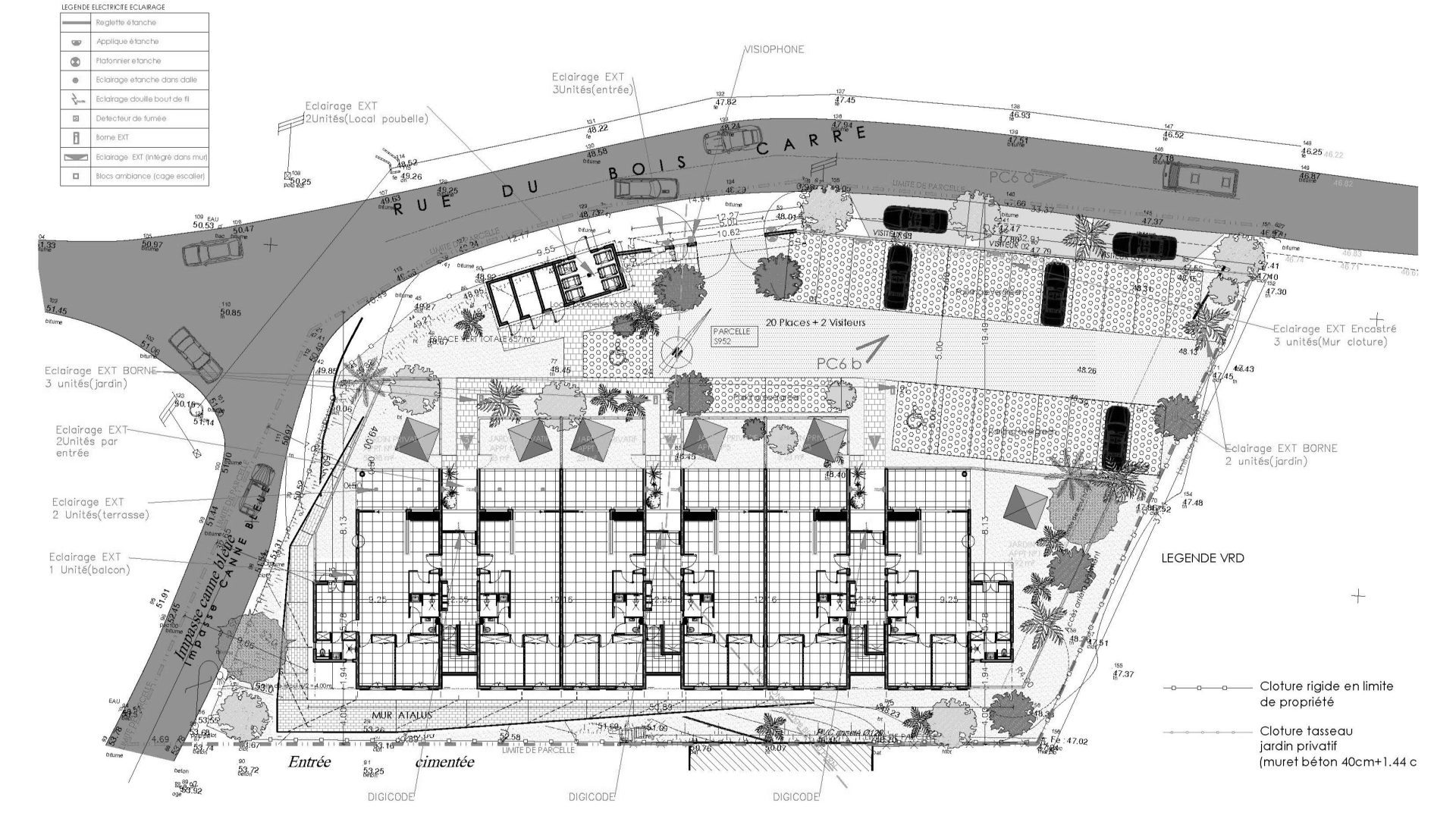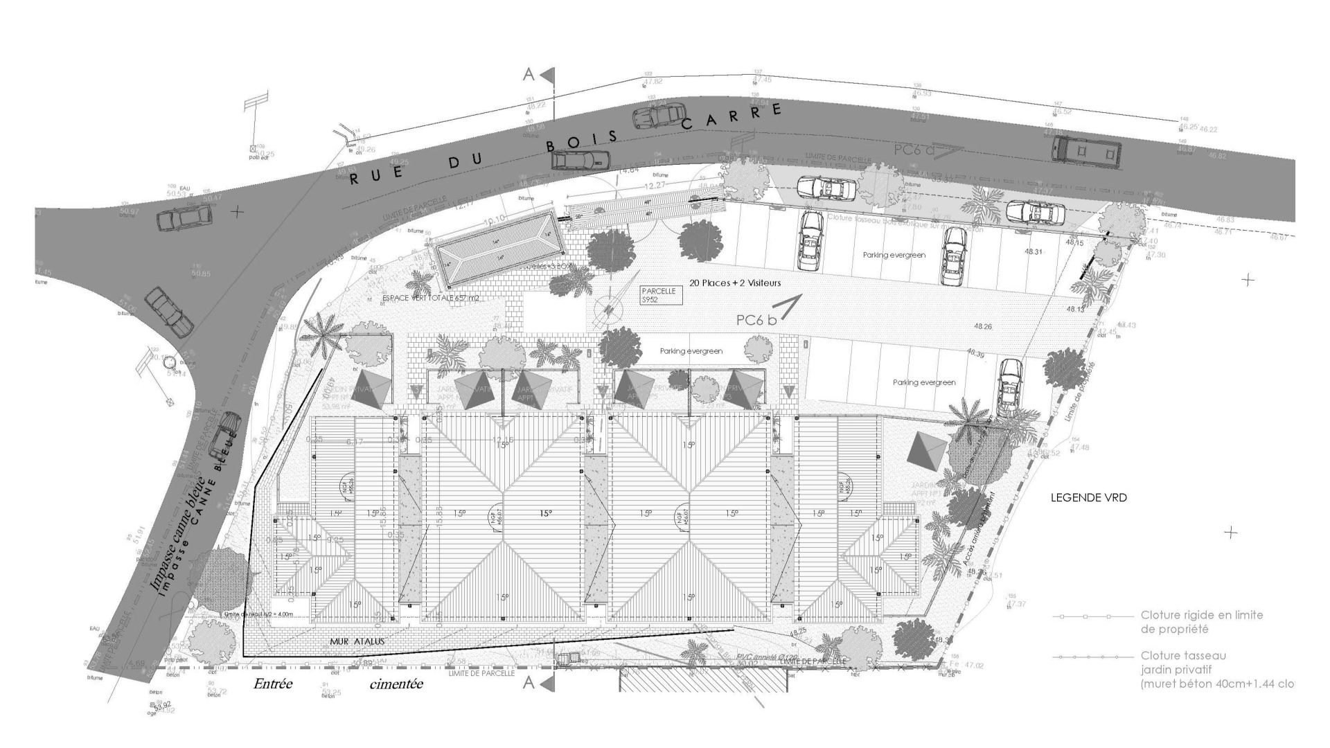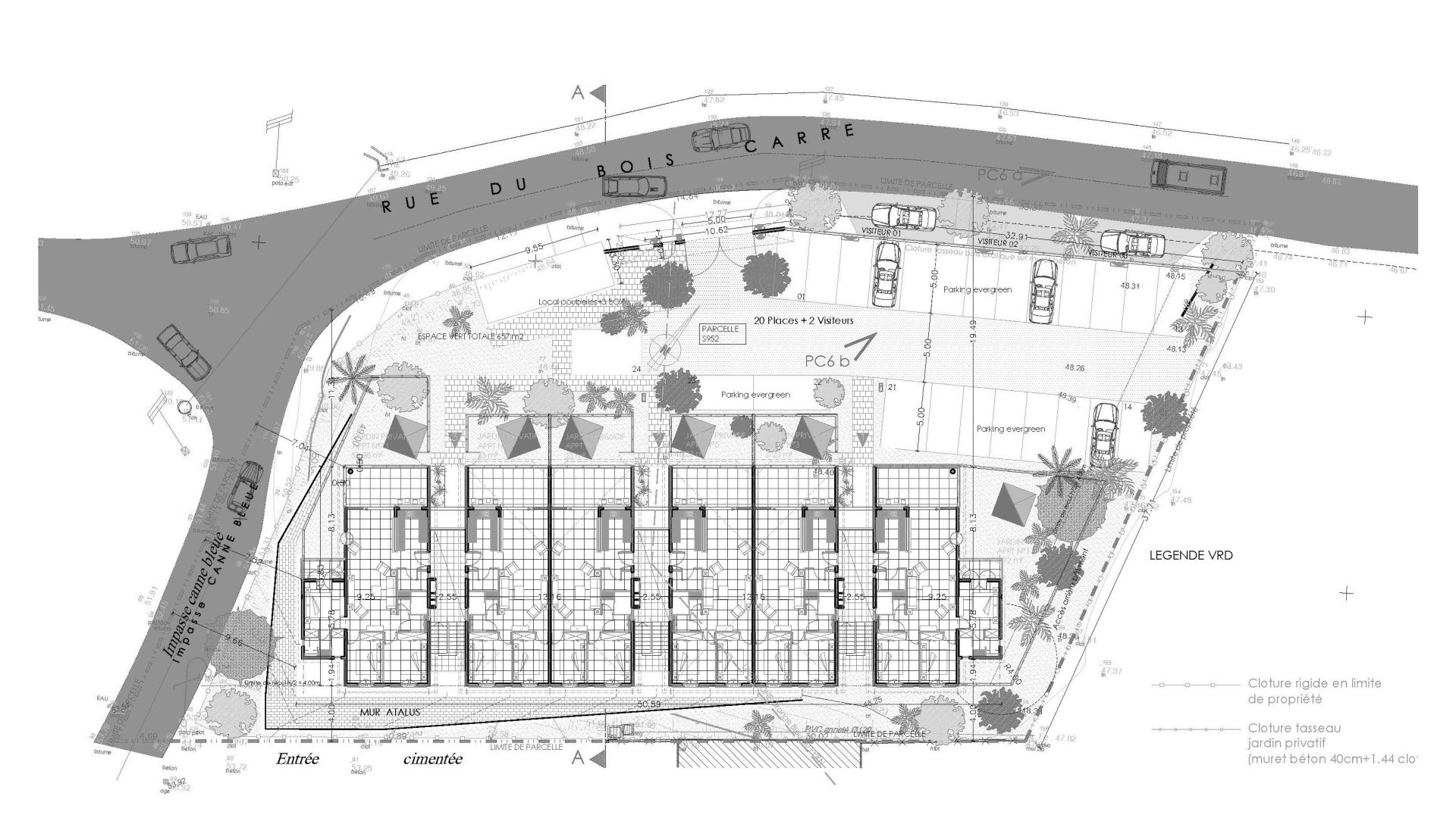 Projet de résidence collective de 12 logements (T3–T4) en R+1, intégrant stationnements paysagers et espaces de stockage privatifs.