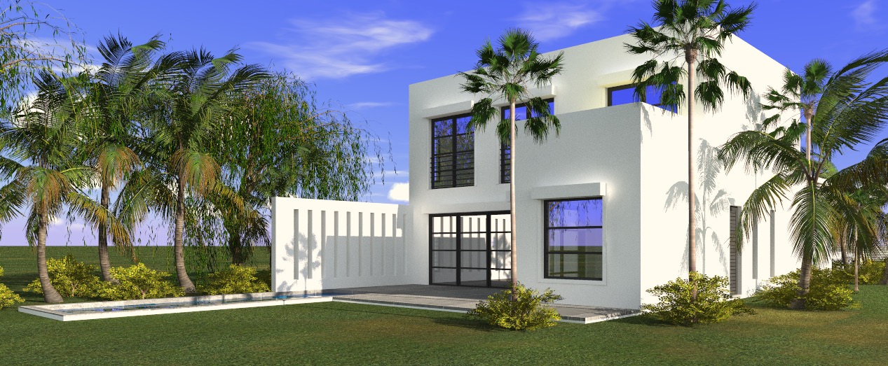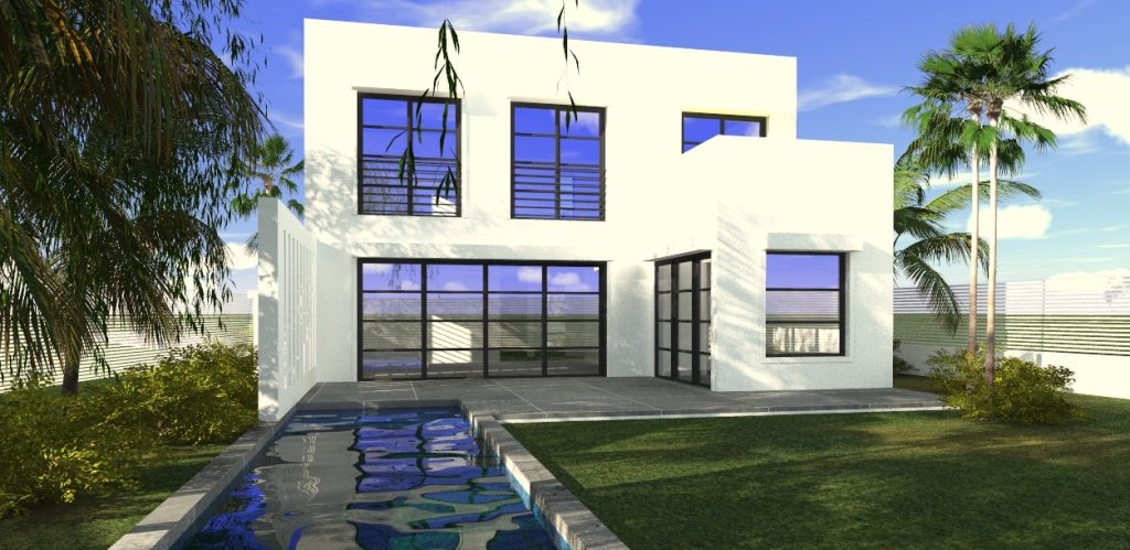 À l’arrière, de larges baies vitrées ouvrent généreusement les espaces de vie vers la terrasse et la piscine, prolongeant naturellement l’habitation vers l’extérieur. L’architecture privilégie ainsi la transparence et la relation avec le jardin environnant, ponctué de palmiers et d’une végétation luxuriante.
